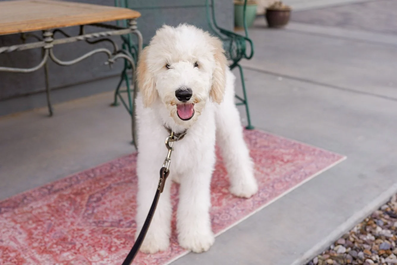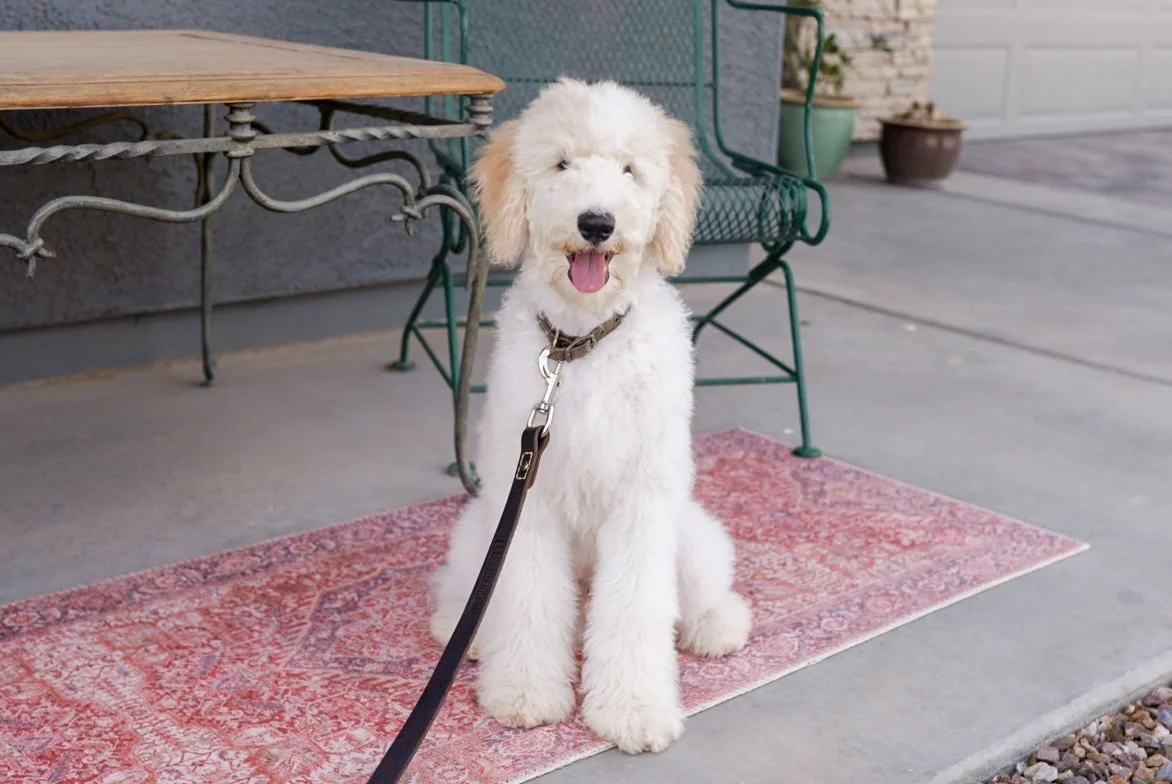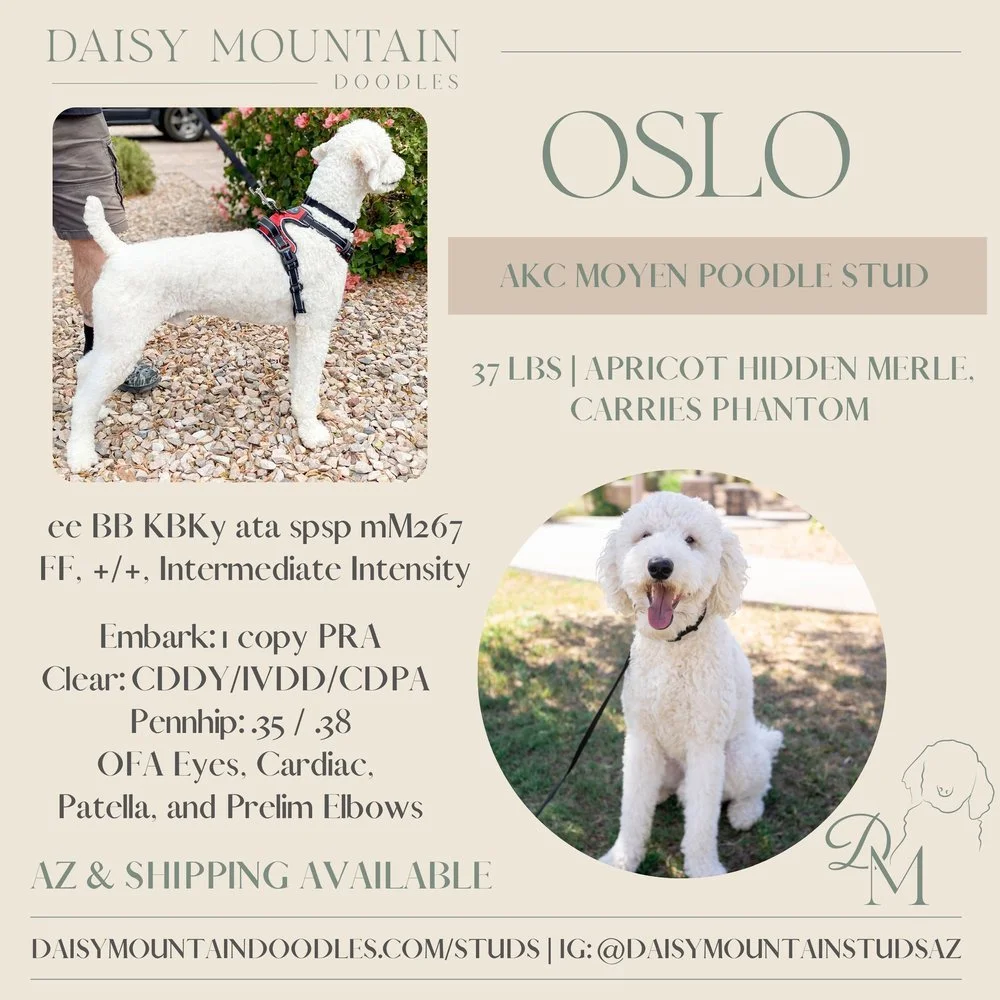Oslo is an 36 pound AKC Moyen Poodle that is so so sweet and has been human focused since day one. He gives the best “puppy eyes” (gorgeous almond shape) and has the best head tilts when he hears noises. He has medium energy and is very smart. Has an average interest in toys (no big prey drive) and is good around kids and other dogs.